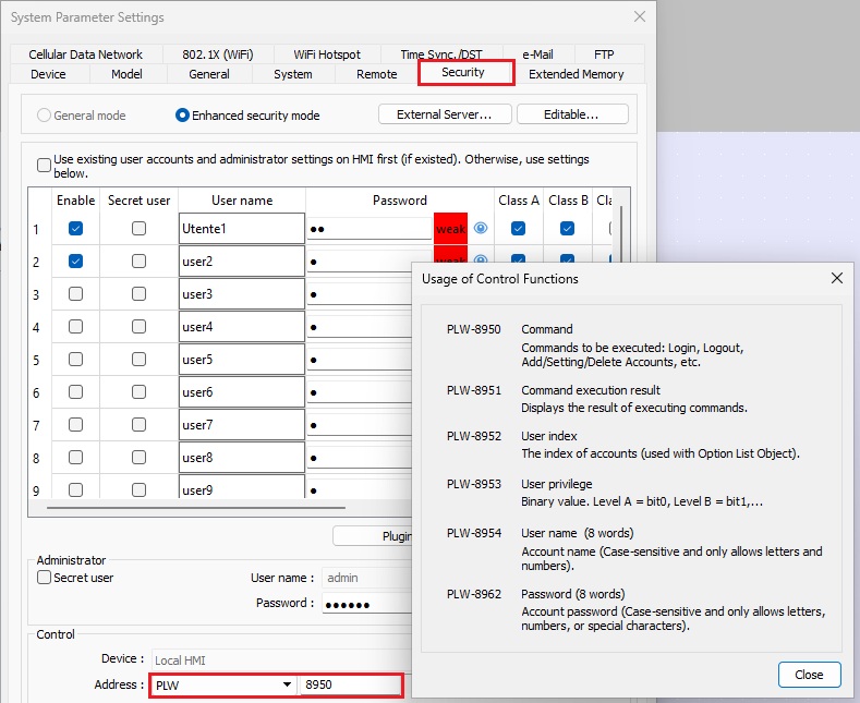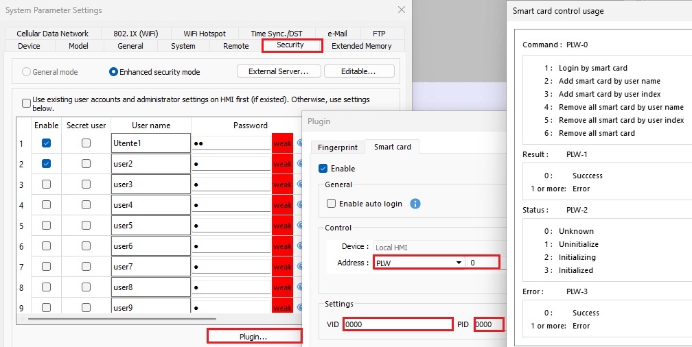 - Login da plugin: Nelle impostazioni di sicurezza di EasyBuilder è possibile attivare il plugin per la gestione del login sia da impronta che da Smart card (Screenshot). Se si utilizza un lettore connesso ad USB occorre rilevare il VID ed il PID tramite un PC e poi definirle nelle impostazioni del plugin. La gestione del login viene gestita dalla PLW impostata nell’oggetto.