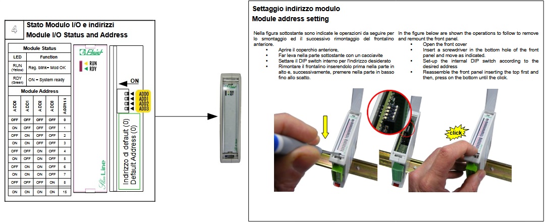 I moduli sono venduti con indirizzo di default 0 il modulo CPU ha indirizzo 255. Naturalmente quando si connettono i moduli di estensione al modulo CPU occorre impostare correttamente l’indirizzo ad ogni modulo. Si può assegnare qualsiasi indirizzo ai moduli (Range da 0 a 15) indipendentemente dalla loro posizione di collegamento al bus, ma non ci devono essere moduli con lo stesso indirizzo connessi al bus.