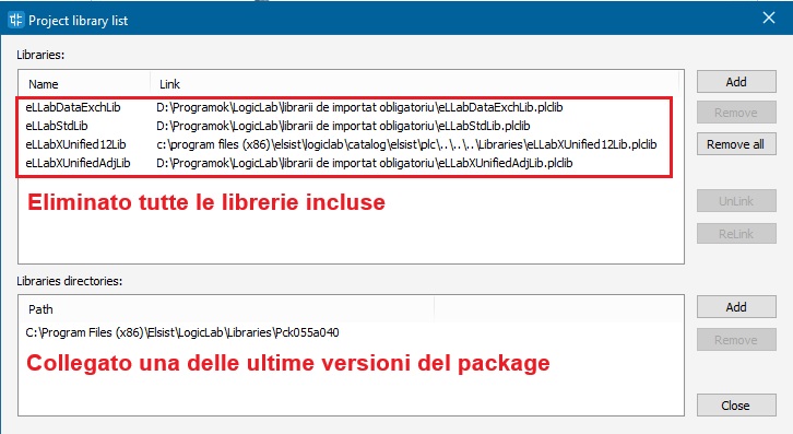 Ormai da alcuni anni consigliamo di non includere più le librerie nel progetto ma di utilizzare la raccolta package librerie, in questo modo nella compilazione LogicLab andrà automaticamente a prelevare dal package gli oggetti utilizzati nel programma. In questo modo ci si adatta alle variazioni di versione in modo molto più immediato. Quindi nel tuo progetto ho modificato le librerie Project->Library manager, in questo modo screenshot.