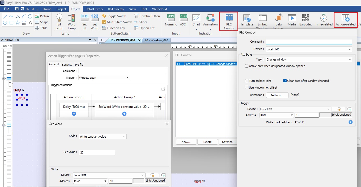 - All’interno della pagina 10 ho inserito un Action Trigger che attende 5 secondi e poi scrive il valore 20 nella PLW 10. In questo modo si passa alla visualizzazione della pagina 20.