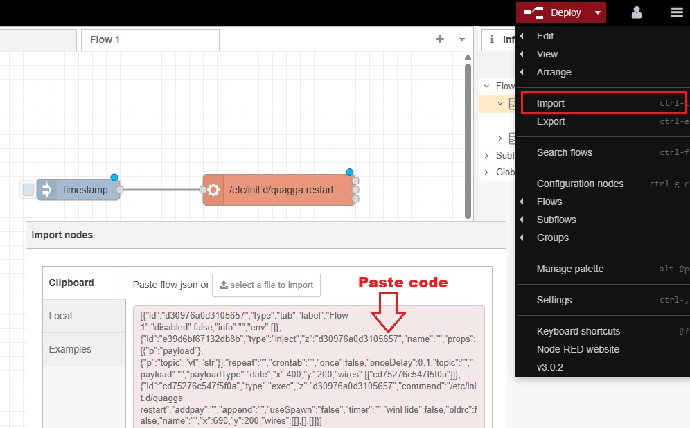 [{"id":"d30976a0d3105657","type":"tab","label":"Flow 1","disabled":false,"info":"","env":[]},{"id":"e39d6bf67132db8b","type":"inject","z":"d30976a0d3105657","name":"","props":[{"p":"payload"},{"p":"topic","vt":"str"}],"repeat":"","crontab":"","once":false,"onceDelay":0.1,"topic":"","payload":"","payloadType":"date","x":400,"y":200,"wires":[["cd75276c547f5f0a"]]},{"id":"cd75276c547f5f0a","type":"exec","z":"d30976a0d3105657","command":"/etc/init.d/quagga restart","addpay":"","append":"","useSpawn":"false","timer":"","winHide":false,"oldrc":false,"name":"","x":690,"y":200,"wires":[[],[],[]]}]